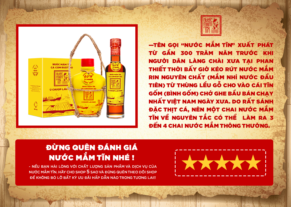 Cặp 2 Nước Mắm Tĩn Cá Cơm Ruột Đỏ độ đạm 60N là dòng nước mắm cao cấp của Bảo tàng Nước Mắm Làng Chài Xưa – Phan Thiết, được chế biến từ cá cơm vàng ruột đỏ quý hiếm và muối tinh khiết. Nước mắm được ủ chượp gần 36 tháng theo công thức truyền thống hơn 300 năm, cho ra đời loại nước mắm siêu đậm đà, thơm dịu, sánh đặc và có hương vị nguyên bản khó tìm thấy ở các loại nước mắm công nghiệp.