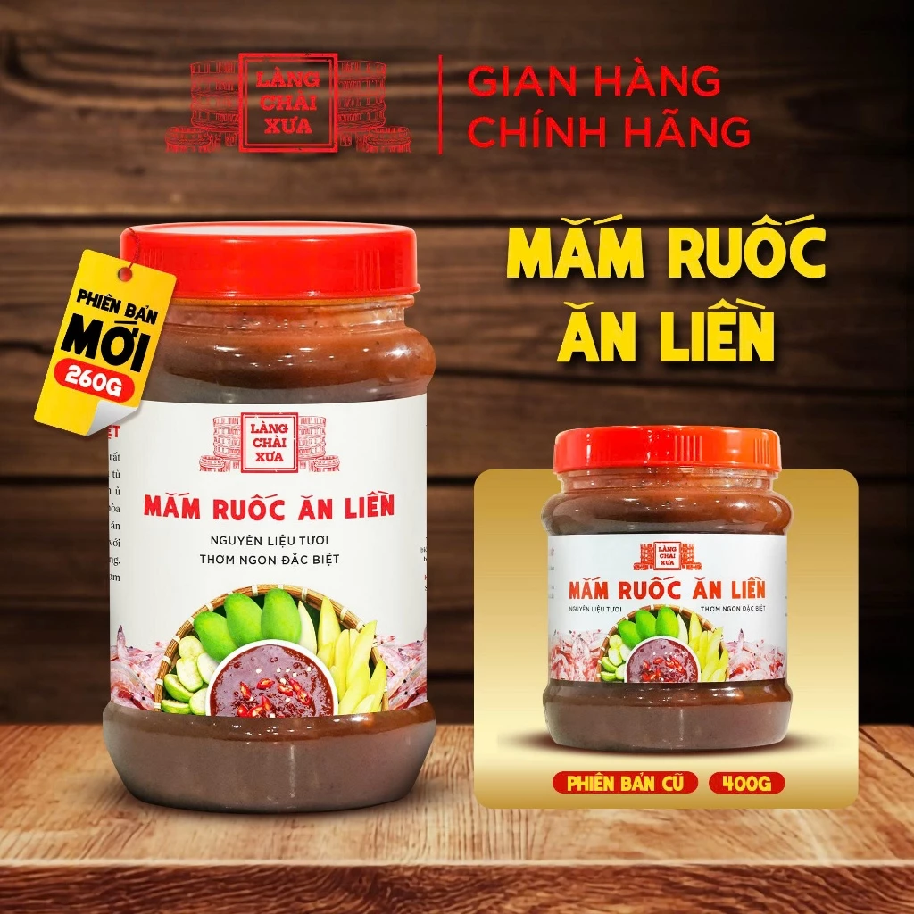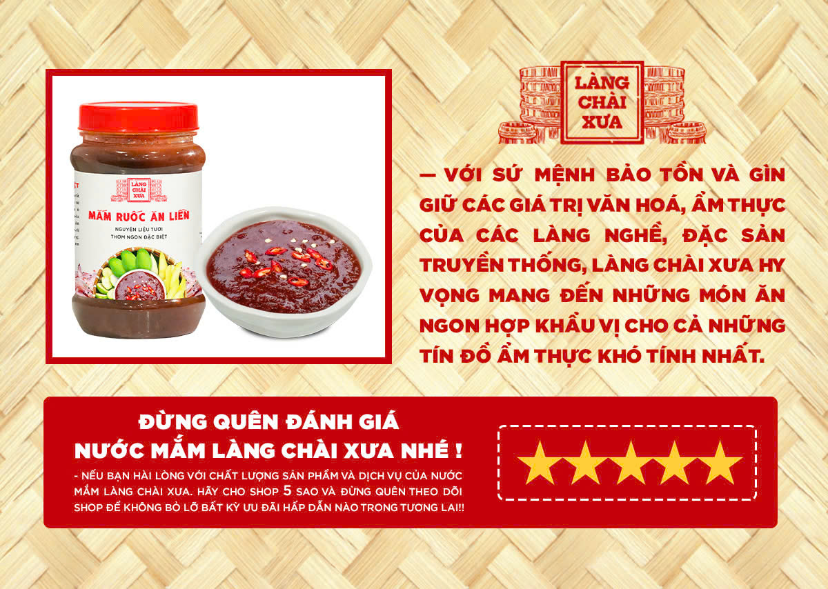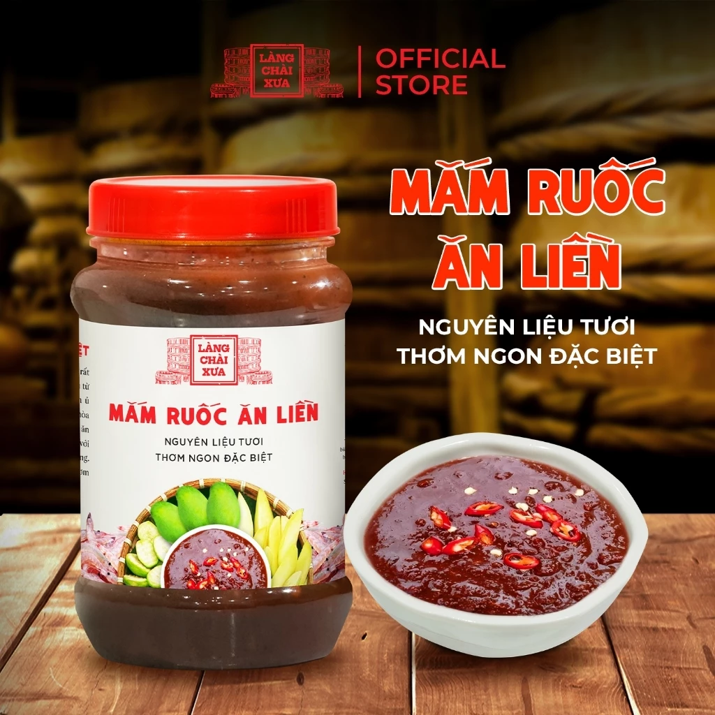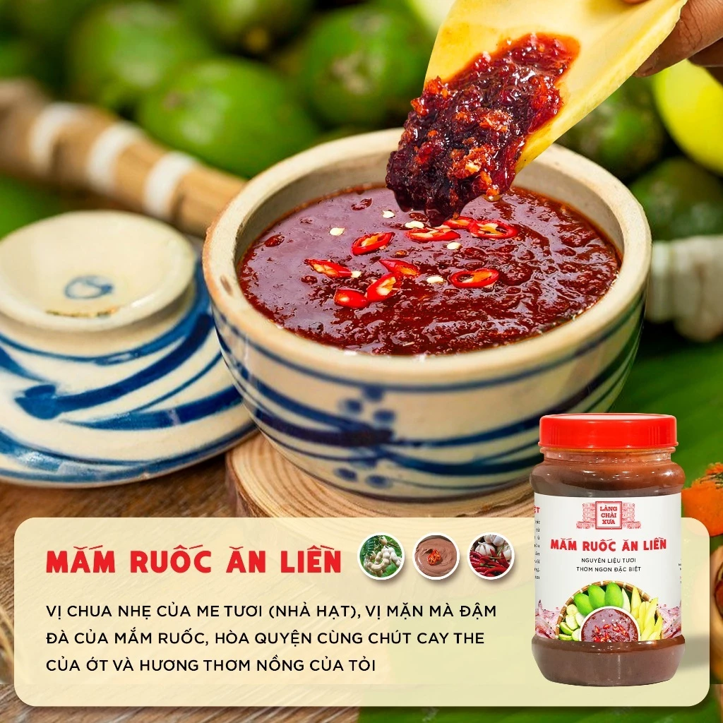 Mắm ruốc tỏi ớt ăn liền Làng Chài Xưa 260g được làm từ mắm ruốc biển lên men, kết hợp me tươi có hột, tỏi, ớt tươi và ủ chượp theo phương pháp thùng gỗ truyền thống Phan Thiết. Hương vị đậm đà, chua cay hài hòa, thơm ngon đặc biệt – rất phù hợp chấm trái cây, bánh tráng, cơm nóng hoặc chế biến món ăn.